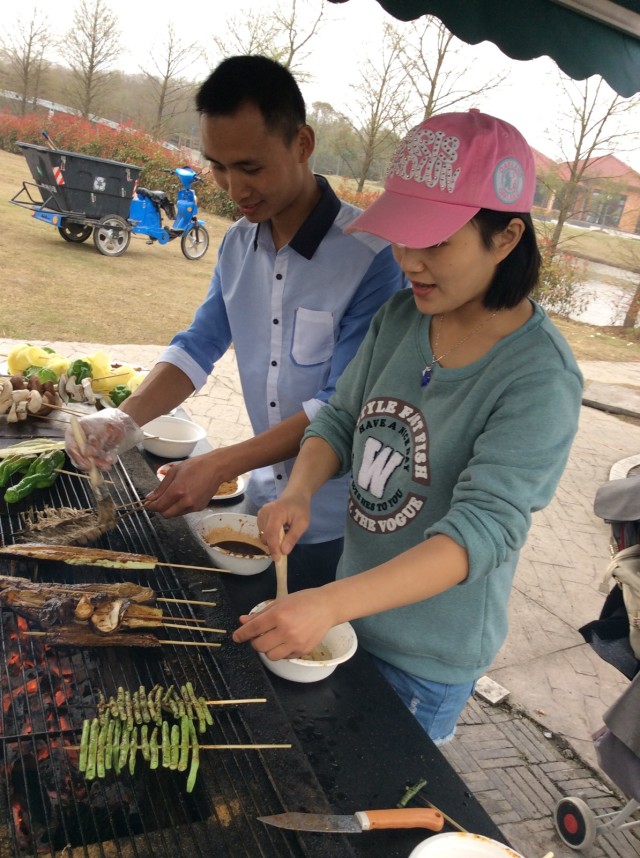 一路歡呼雀躍到達了目的地,迎著清涼的春風,踏著歡快的步伐,大家大包小包的提著燒烤食物,臉上掛著燦爛的笑容,來到燒烤的地方,稍做休整后,燒烤開始了,大家頓時忙開了,有的擇菜洗菜,有的烤菜,有的放油,有的放作料,有的還舞動著鍋鏟忙得不亦樂乎呢,有的在做水果沙拉,有的只等著吃了。哇!菜可真豐盛呀,有肉、有豆腐皮、有青菜、茄子、香菇、小魚、貢丸,真讓人垂涎三尺呀,迫不及待地拿起筷子夾起一塊肉吃,一口咬下去,哇香香的,嫩嫩的,好吃極了!